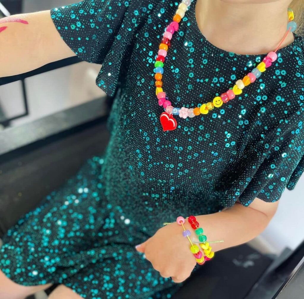 Imagine a table beautifully laid with sequins, with a beading station for each party guest, and the shiny and joyful selection of beads!