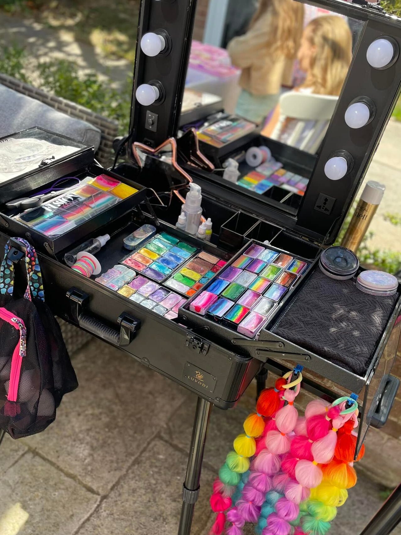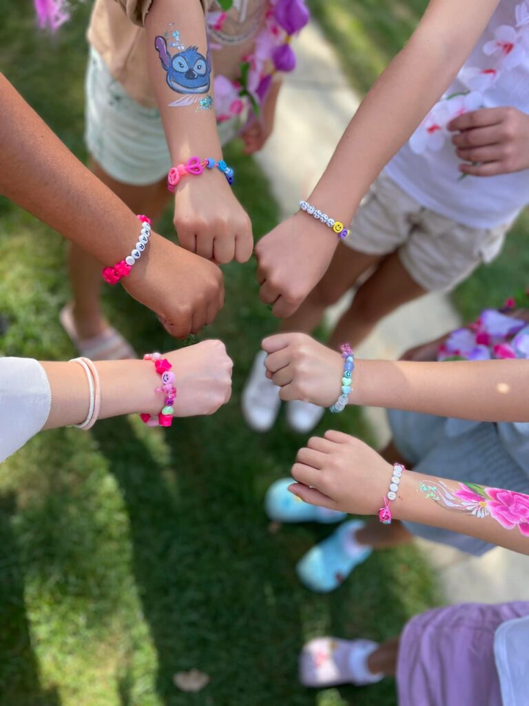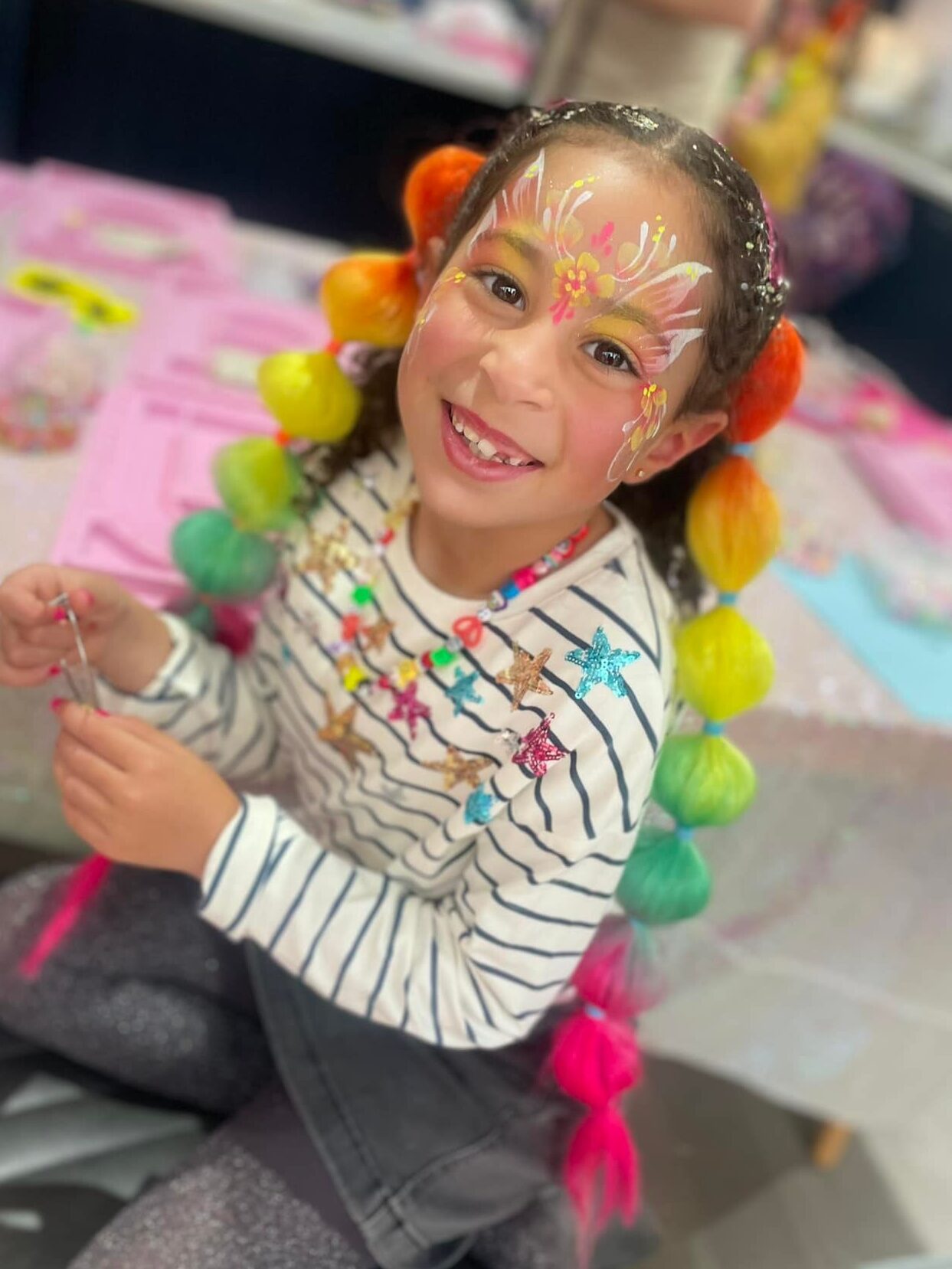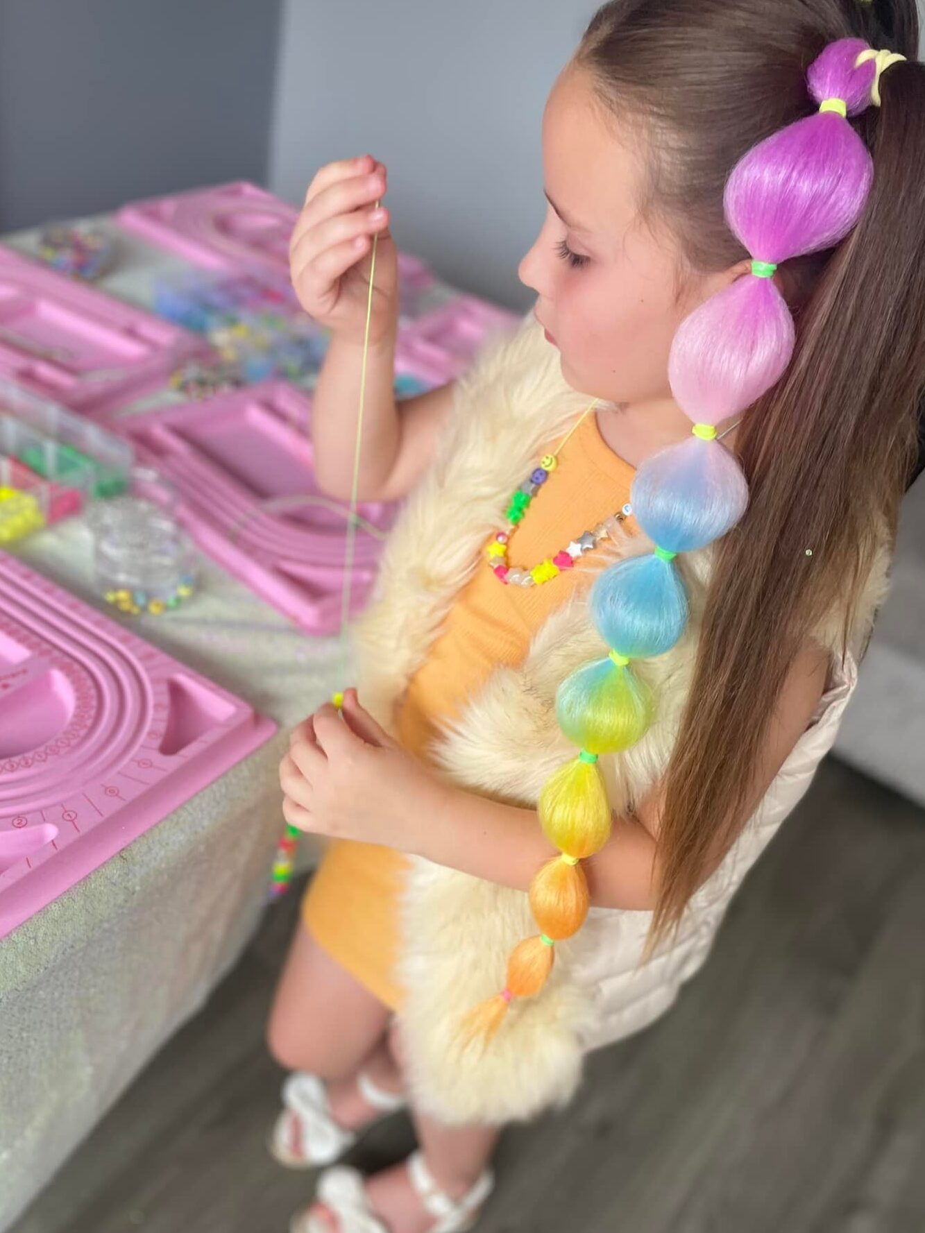 Whilst the children make their bracelets, zip charms and bead pens, they each have the opportunity to have coloured bubble braids added to their hair and a touch of sparkle.